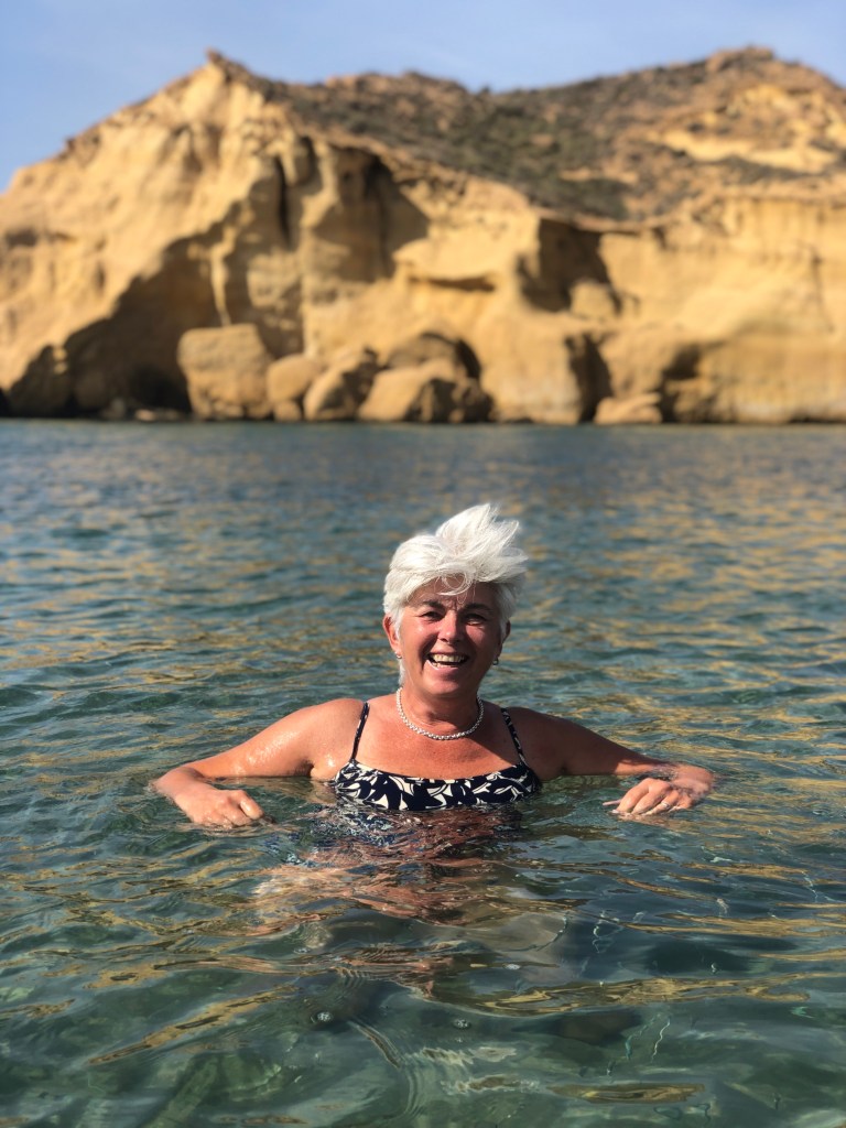 We awoke the next day, Monday September 18th, to still glorious views of golden sand and crystal clear water so decided to spend the morning chilling and enjoying the beach. A baker’s van arrived around 08.00 so that was breakfast sorted! We were having a lovely time sitting and reading or, if you’re Liz, exploring the caves that we didn’t leave until after 15.00 to drive towards Gabo de Gate-Nijar. The lighthouse itself was not quite as expected but the sunset was lovely and we managed to find a spot by the beach just off the road to spend the night. (P4N#440155).