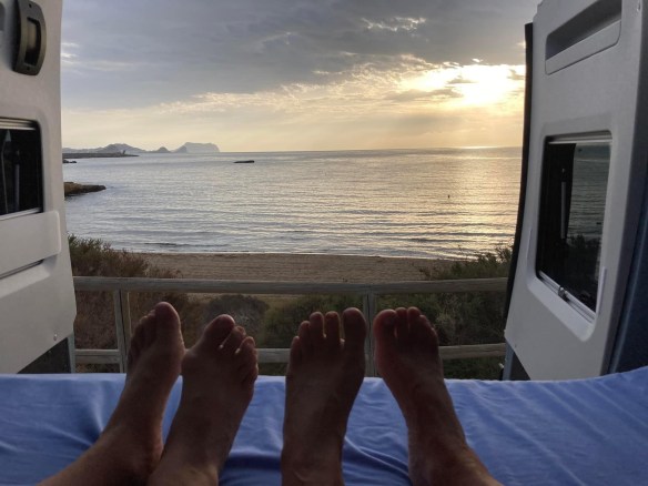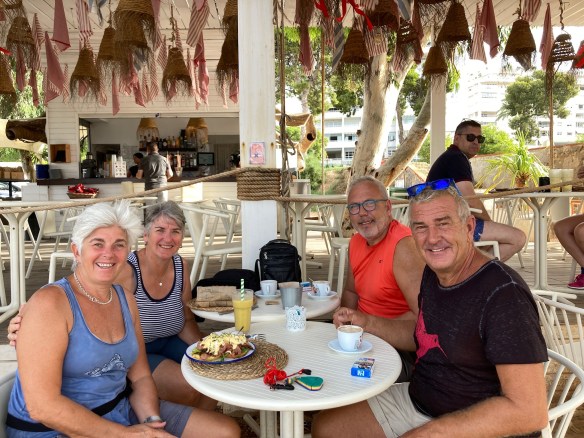 We had time for a drink on a terrace overlooking the sea before leaving at 15.45 to head towards Alicante to meet up with friends, Lionel, Antonio and Freya the cockapoo on board Yacht Arabesque for the evening. We parked up on a side road very close to the beach at Playa de L’Almadrava (P4N#69315), just north of Alicante where Arabesque was anchored for the night. Pre dinner drinks and a swim on board before eating at the local beach bar, La Gallina. So lovely to catch up with them and we even had breakfast with them at the same beach bar the next day!