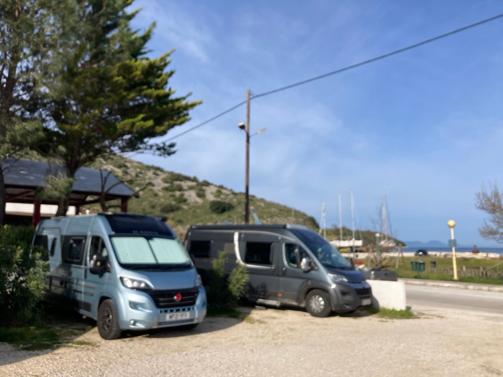 We found ourselves somewhere to camp inside that had a bit of privacy and electrical sockets so we could charge laptops etc. The crossing itself was smooth and uneventful but it took an age to unload. We wanted to stay overnight at a camp stop in Plataria (P4N#431994) around 15 minute drive away. We weren’t sure how many free spaces there would be and felt that most of the other vans on the ferry would also be making their way there. As it happened, we all managed to just fit in so everyone got a good rest overnight before continuing our respective journeys. The place was right next to the beach and had water, showers etc. all for €10 per night. There was even electricity for a small extra charge if you wanted it. Great value and perfect for our needs.