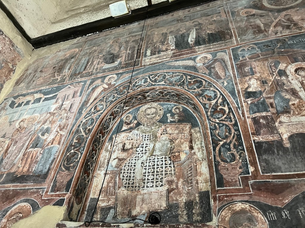 On Monday morning, April 1st, we left our spot before 0900 to go round to another part of the lake for breakfast but whilst it was a nice view, the supposed beach was non existent! After we had eaten we continued out of the park, which took at least an hour and a half to make our way to Belgrade or Beograd as Serbians call it. We passed back through the Mokra canyon where we didn’t stop on Saturday evening and even found the missing park up which was right next to a small monastery and chapel. The road to it was very narrow with over hanging rocks and small tunnels so we were very glad we didn’t try it in the dark. The chapel had some glorious frescoes.