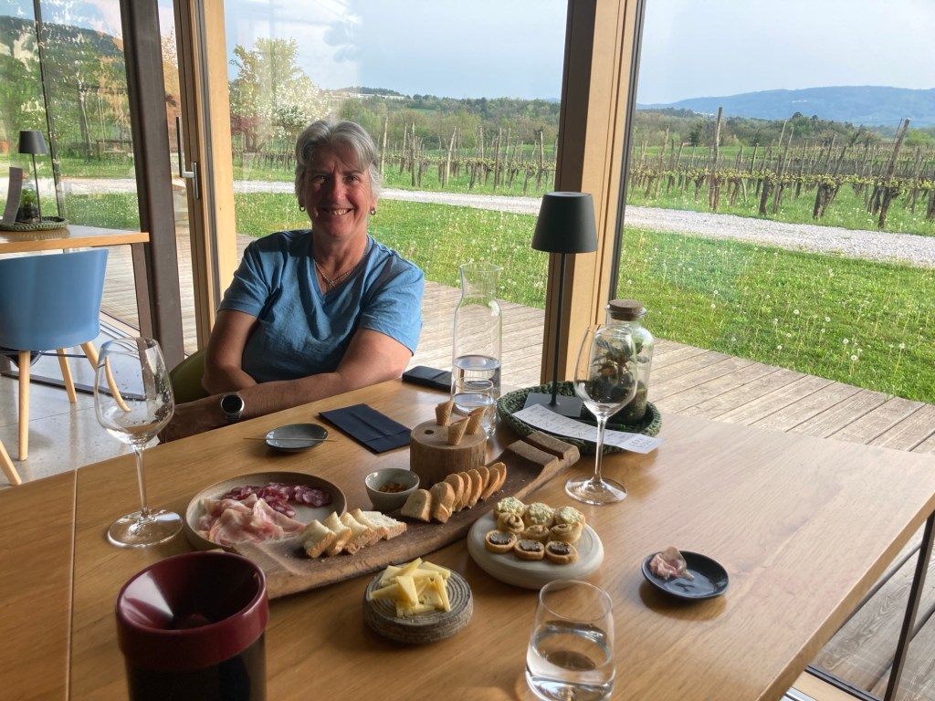 The Soča valley is famous for its wineries and we wondered if we could find one that was doing a wine tasting that evening. Not only did we find one but, more importantly, it also allowed campervans to park there overnight for a nominal fee (P4N#90585). Result! We arrived at the winery, Lepa Vida, at 17.00 and rang the owner to book ourselves into their wine tasting at 18.00. It was glorious setting overlooking the vines down a very quiet country road. The wine tasting cost €25pp and lasted two hours with fabulous snacks to accompany some very nice wine. Irena, one of the owners, gave us so much history on the wines and Slovenia in general. The name, Lepa Vida, is in honour of the 6,000 local Slovenian women who went to work in Egypt from the opening of the Suez Canal in 1869 until WWII as nannies and wet nurses to rich Europeans so that they could send money home. There were only four of us for the wine tasting so it made for a wonderful, exclusive evening. Of course, we ended up buying a case of wine so it wasn’t that cheap a stopover. It was just as well that after trying seven different wines we didn’t need to go far for our accommodation!