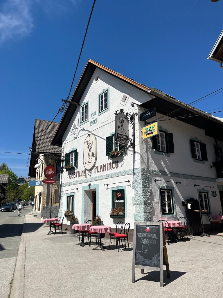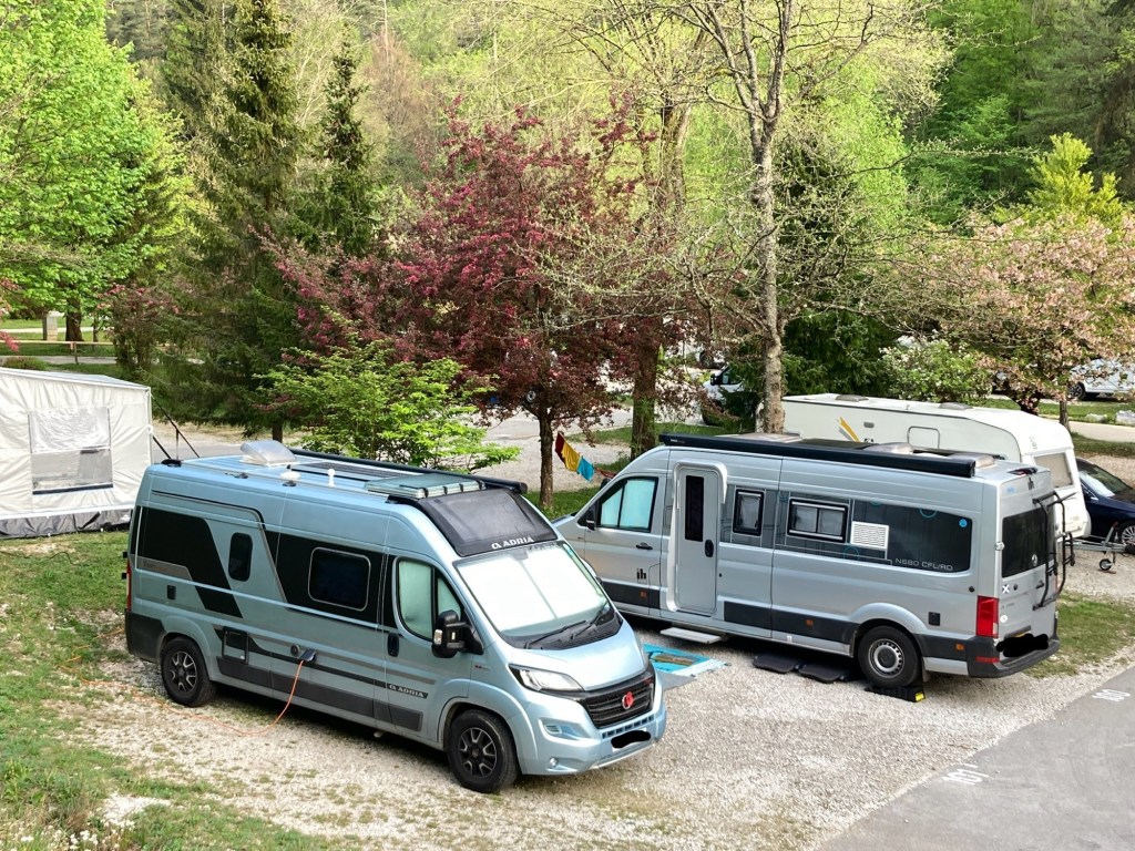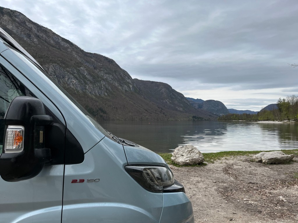 As the campsite wasn’t busy, they were very relaxed what time we left so it ended up being well after midday. We needed to make our way to Lake Bled to meet up with our neighbours, Stuart and Wendy, who were making their way south in their van, Hetty. It was a long journey and took all of 30 minutes!
