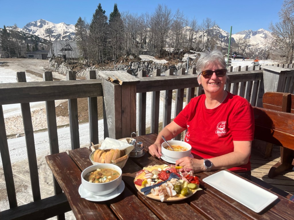 Friday morning was another hot, sunny day so we took the cable car up the mountain behind us to the top of Mount Vogel (part of the Julian Alps) where there was still snow and people were skiing on the last day of the ski season. An amazing breakfast at the top with views of Mount Triglav.