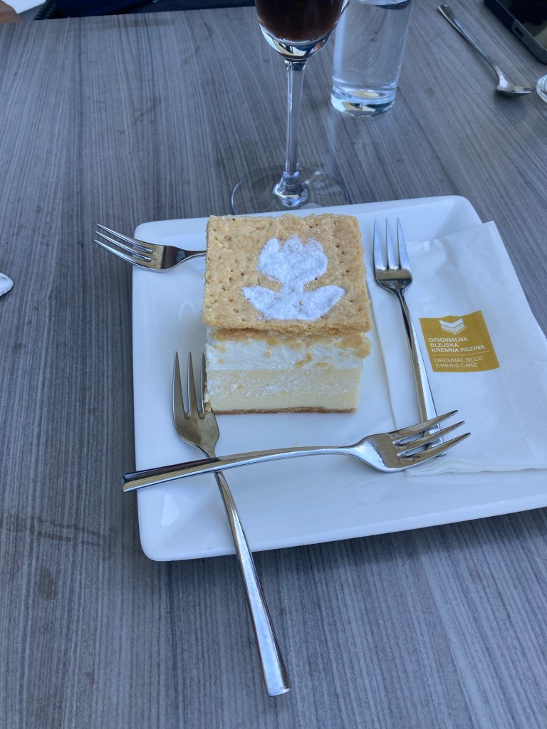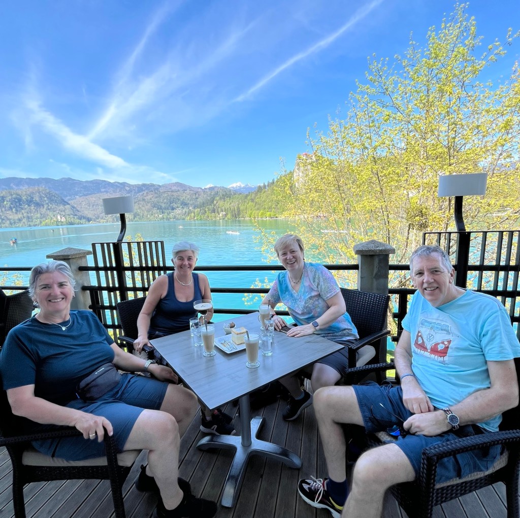 Saturday morning was another brilliantly sunny day with hardly a cloud in the sky so we hired bikes to cycle around the lake and take in the sights. Stuart and Wendy have fold up Brompton bikes and the four of us set off. It should have only taken us 30 minutes to complete the circuit but we had to stop for the obligatory coffee and Bled cake, although Liz passed on the coffee and went straight for an expresso martini!