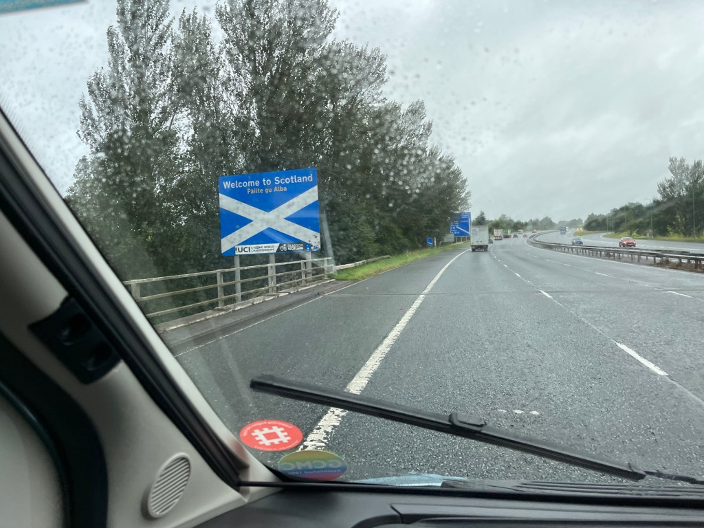After a slight delay due to seeing a consultant about Jo’s knee and her subsequent steroid injection, we set off to Edinburgh late Tuesday morning (August 13). We needed to be at the site just north of Edinburgh by 20.00 so we only stopped for coffee refills and the toilet during our 400 mile drive north. A quick stop at Keele and Tebay services meant we arrived with 45 minutes to spare. We had taken the scenic route along the A702 from the A74 and it was gorgeous in between the rain showers! Onto our pitch and we were soon heating up the lovely pies we bought at Tebay Services Farmshop. We were shocked how cold it was in comparison to down south. There must have been at least a 10°C difference in temperature and it had started raining from Stafford onwards. Relatively early to bed as it had been a long day.