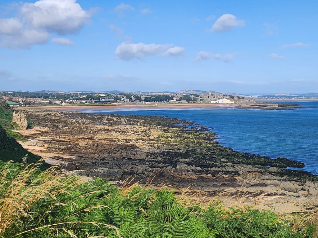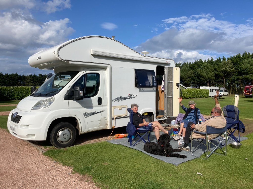 We arrived at the St Andrews campsite around 17.00 to meet up with Helen, James and their dog, Knox, in their motorhome along with Jane & Maria in their Twin, Arty. Arty is a slightly longer version of Dora. We were all there for the British Women’s Golf Open. Luckily, James’ and Helen’s Moho (it doesn’t have a name) could accommodate all 6 of us so gin and tonics there before a ‘Ready, Steady Cook’ type BBQ which we ate in said Moho. We were even treated to Helen playing the guitar!
