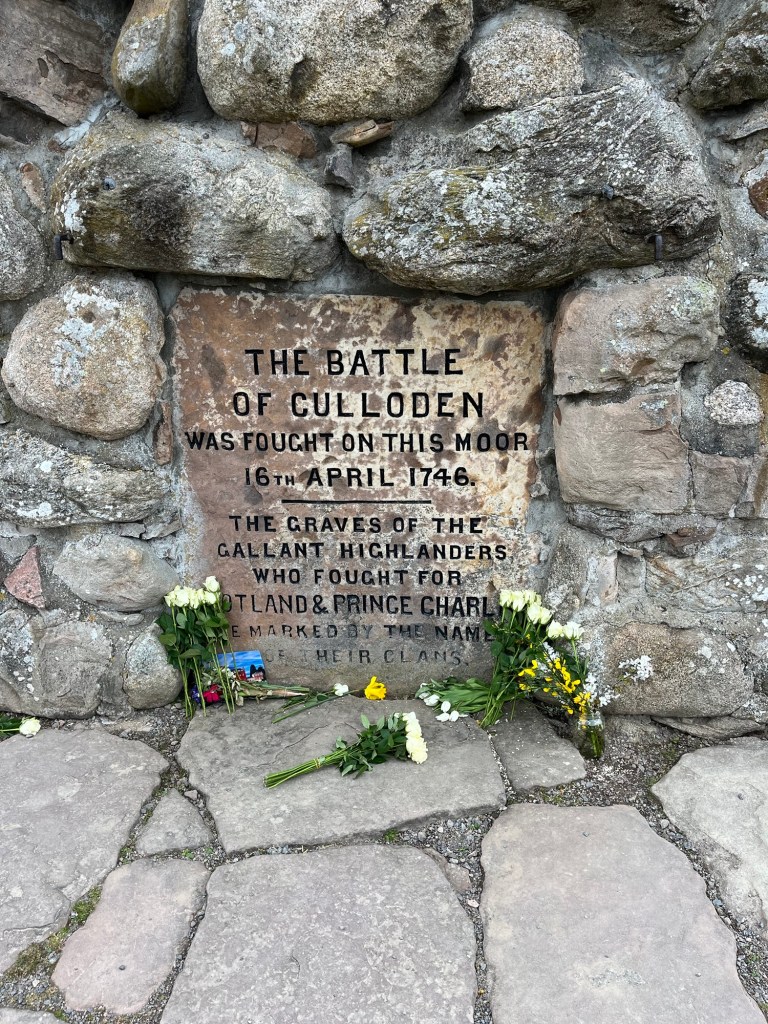 Culloden Battlefield is where on April 16 1746 the Duke of Cumberland defeated the Jacobite army under Bonnie Prince Charlie. The battle lasted just one hour with the Jacobites losing over 1500 men. There was an informative and immersive exhibition before we found the stone on the battlefield site for Clan Fraser who had been on the front line. It was all quite moving.