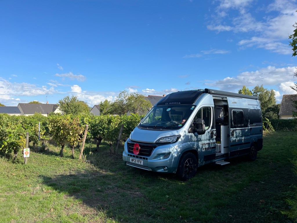 We then had a long drive of 300km down to the Loire Valley for our night stop at the Fourrier and family vineyard at Distrè, just outside Saumur. As we need to get there before 19.00, we made the decision to go via the tolled roads. Definitely quicker but €53 lighter! We won’t be making go that mistake again. However, we arrived at the vineyard just before 18.00 and parked up amongst the vines. The owners are associated with France Passion which allows its members to stay in lovely rural locations such as vineyards or farms. They even gave us a bottle of their white wine to have with our meal. We will be tasting their award winning Cremant tomorrow!
