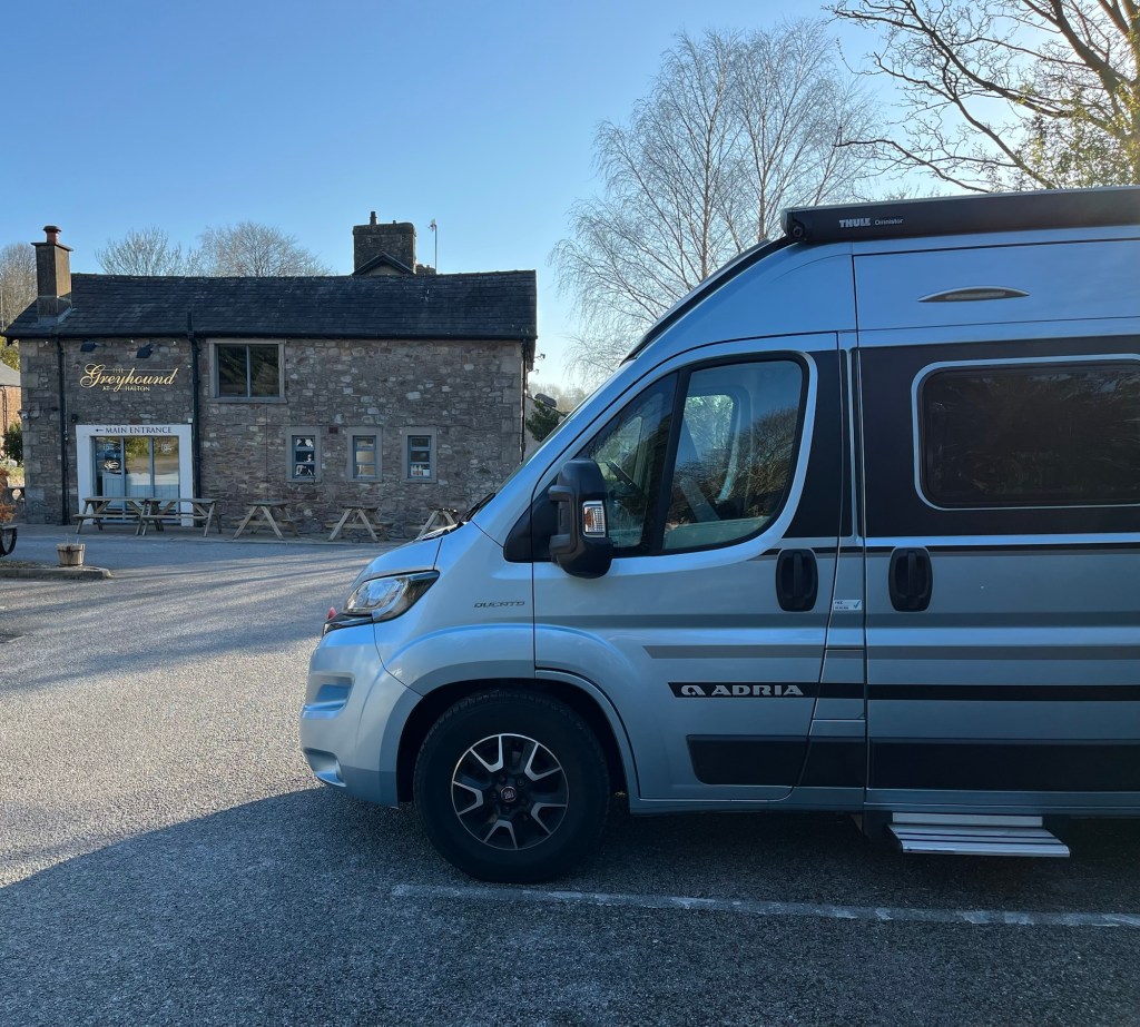 We finally set off on our Scotland adventure on Monday, April 7th just after lunch some 5 days later than originally planned due to Jo’s pre-op hospital appointments in preparation for her knee replacement surgery at the end of April. We got as far as Lancaster and stopped at a pub, the Greyhound at Halton, for a delicious dinner and overnight stop in their car park (S4S-S476745).